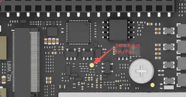 Locate the BIOS reset test pad. It is positioned 12 mm to the left of the M.2 E-key mounting column, as shown in the picture below.
