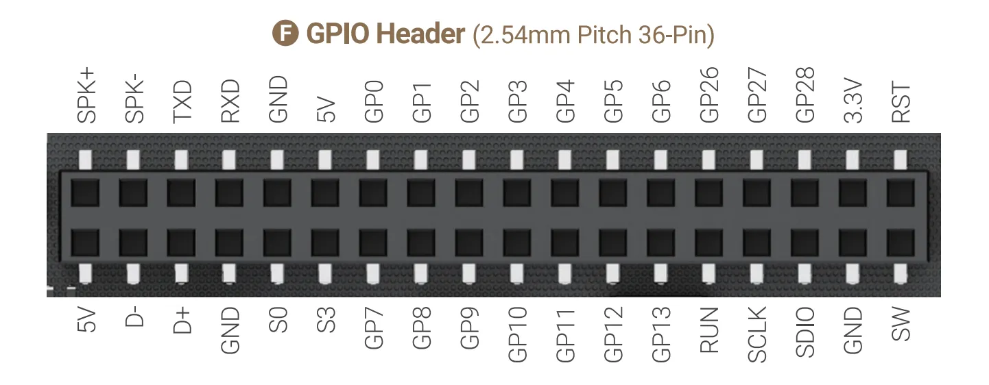 LattePanda Iota features a comprehensive 36-pin GPIO header, serving as a versatile interface for system control, peripheral expansion, and custom hardware integration. It provides direct access to a wide range of signals, including those from the onboard RP2040 MCU, USB 2.0 lanes, system status indicators, and audio outputs.