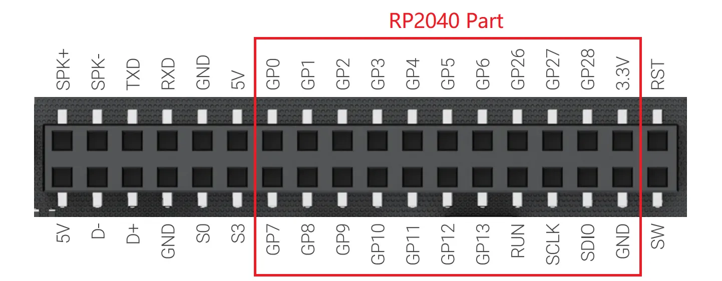 Most of the RP2040's GPIOs are routed out through the header, as shown in the figure below.