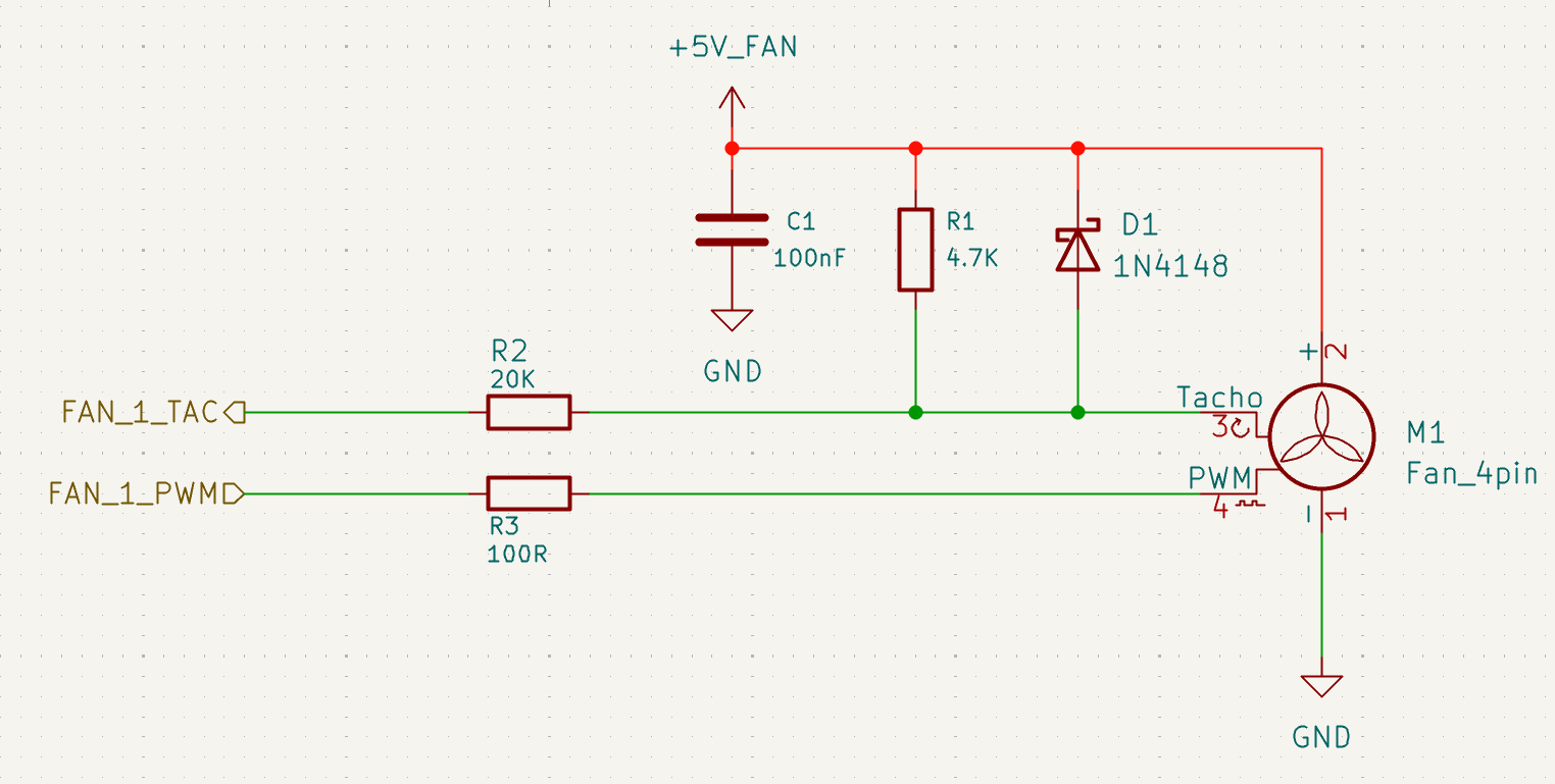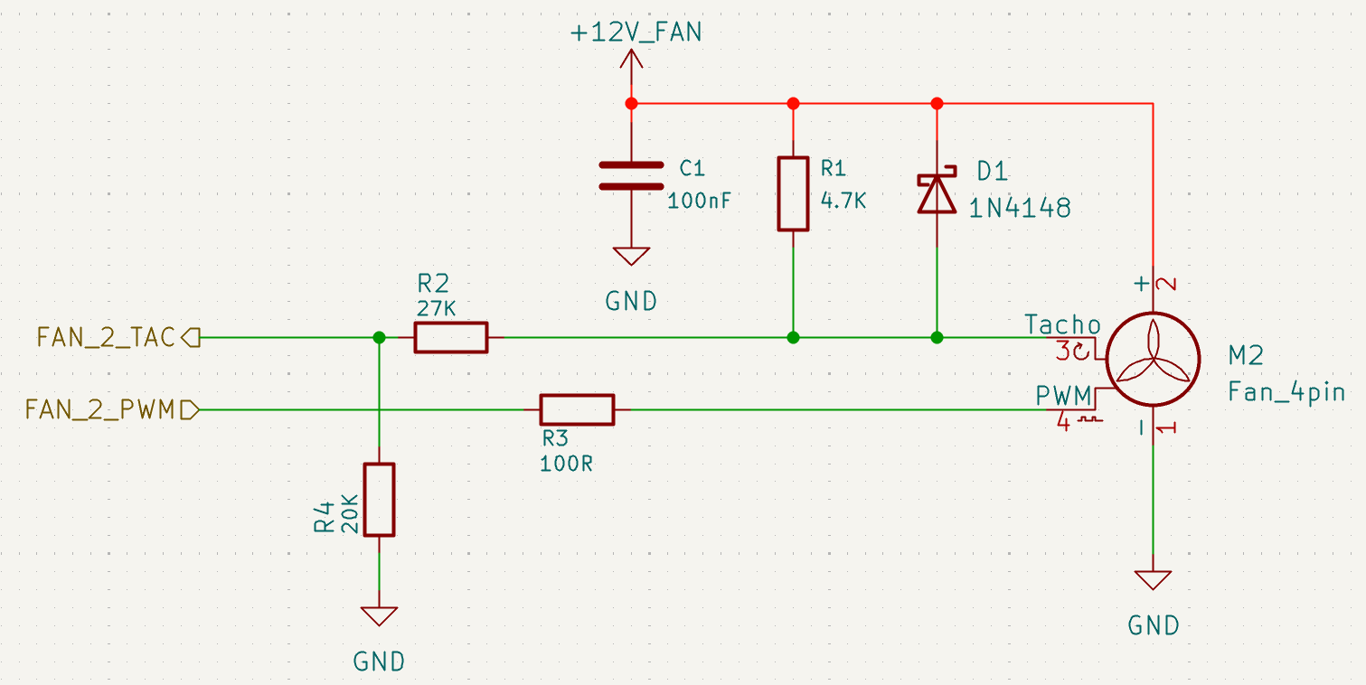 - 12V Fan: A resistive voltage divider (multiple resistors in series) is MANDATORY to step down the 12V tachometer signal to a safe logic level (≤ 5V) compatible with the compute module.
