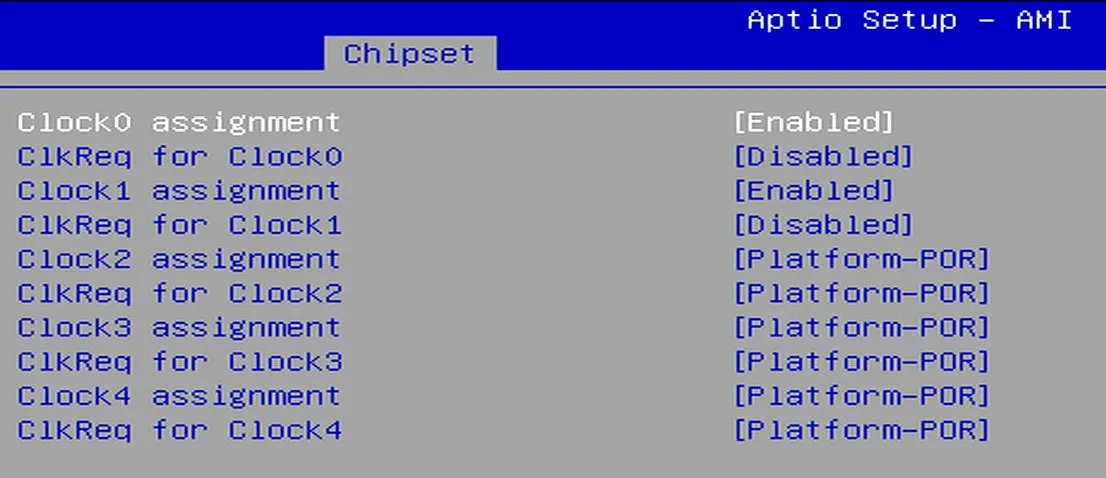 Chipset -> PCH-IO Configuration -> PCI Express Configuration -> PCIE Clocks -> Clock assignment / Clkreq for clock